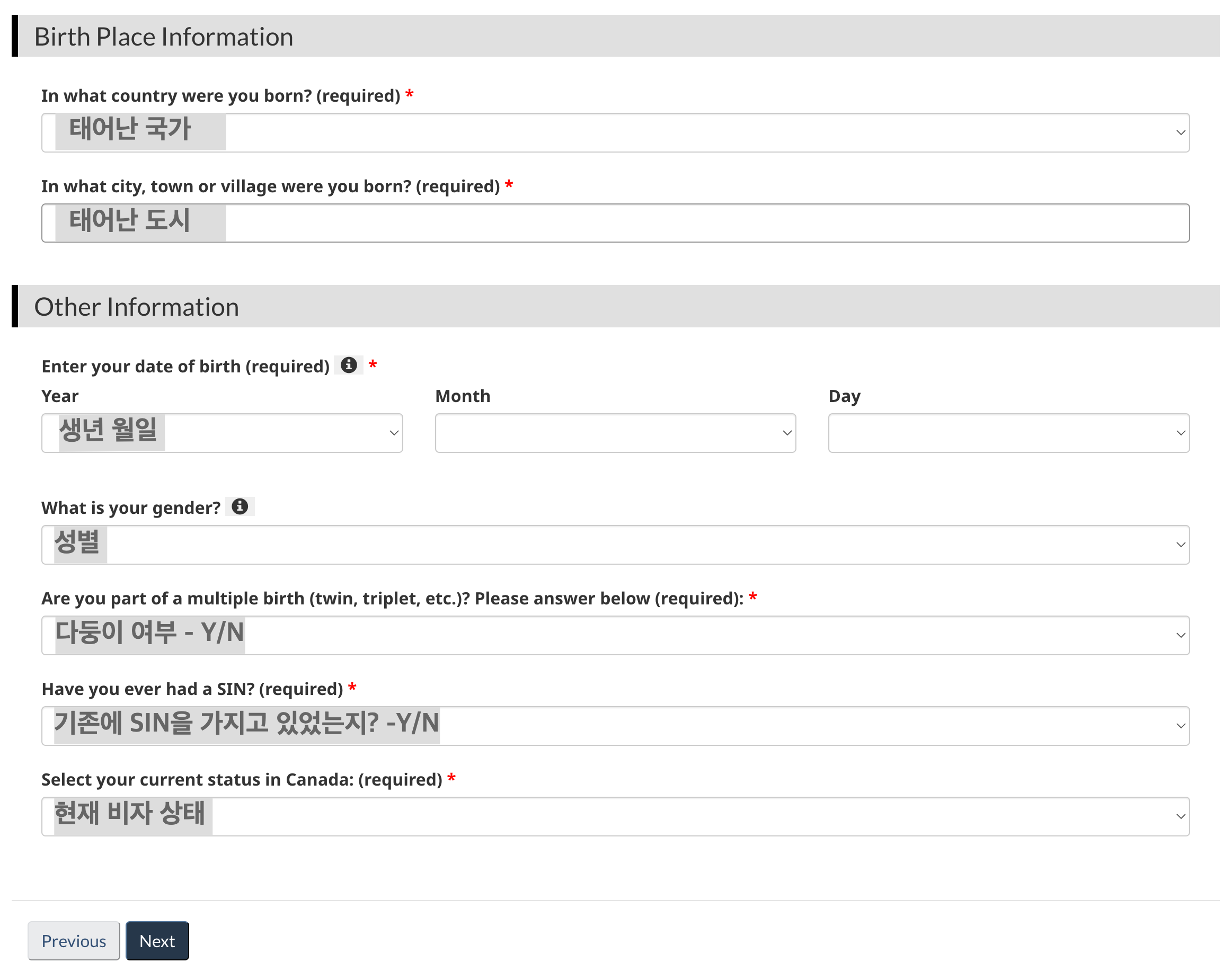 **여기에서 What was your family name at birth? 는 출생 신고 시 성을 묻는 건데, 해외에서는 혼인 후 남편 성으로 바꾸는 문화 때문에 묻는 질문인 것 같다. 결혼 후에도 성이 변하지 않는 대부분의 한국인은 해당사항이 없으니 현재 본인의 성을 사용하면 된다. 혹 어떠한 이유로든 출생 시 신고한 성과 현재의 성이 다르다면 기재하면 된다.